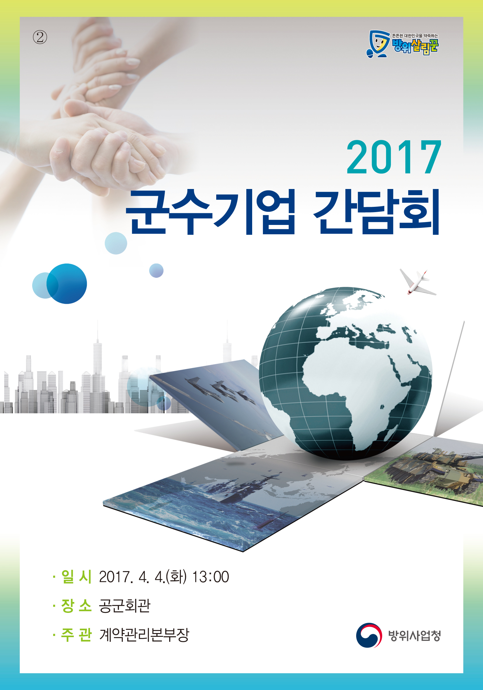 ¹æÀ§»ç¾÷û, ±¹¹æ±â¼úǰÁú¿ø, °ü·Ã¾÷ü °£ »óÈ£ ÀÌÇØÁõÁø°ú °ø°¨´ë Çü¼ºÀ» ¹ÙÅÁÀ¸·Î ¿ì¼ö ±º¼öǰ Àû±âÁ¶´ÞÀ» À§ÇÑ 17³â ±º¼ö±â¾÷ °£´ãȸ¸¦ ¾Æ·¡¿Í °°ÀÌ °³ÃÖÇÕ´Ï´Ù.
